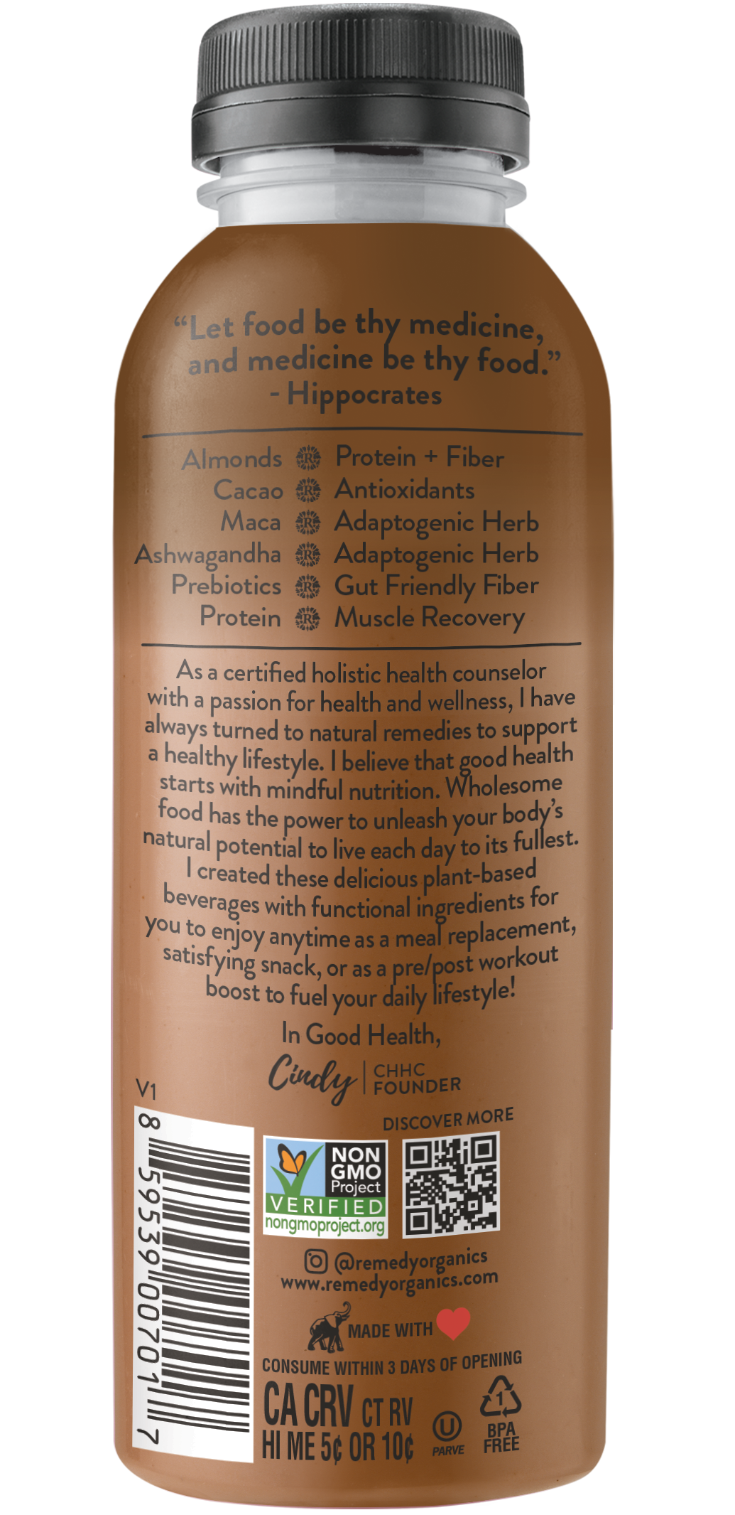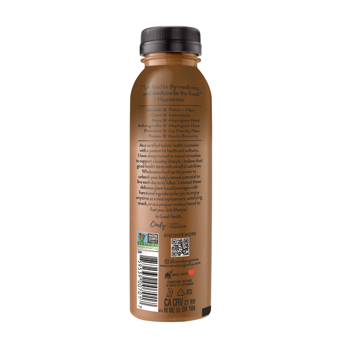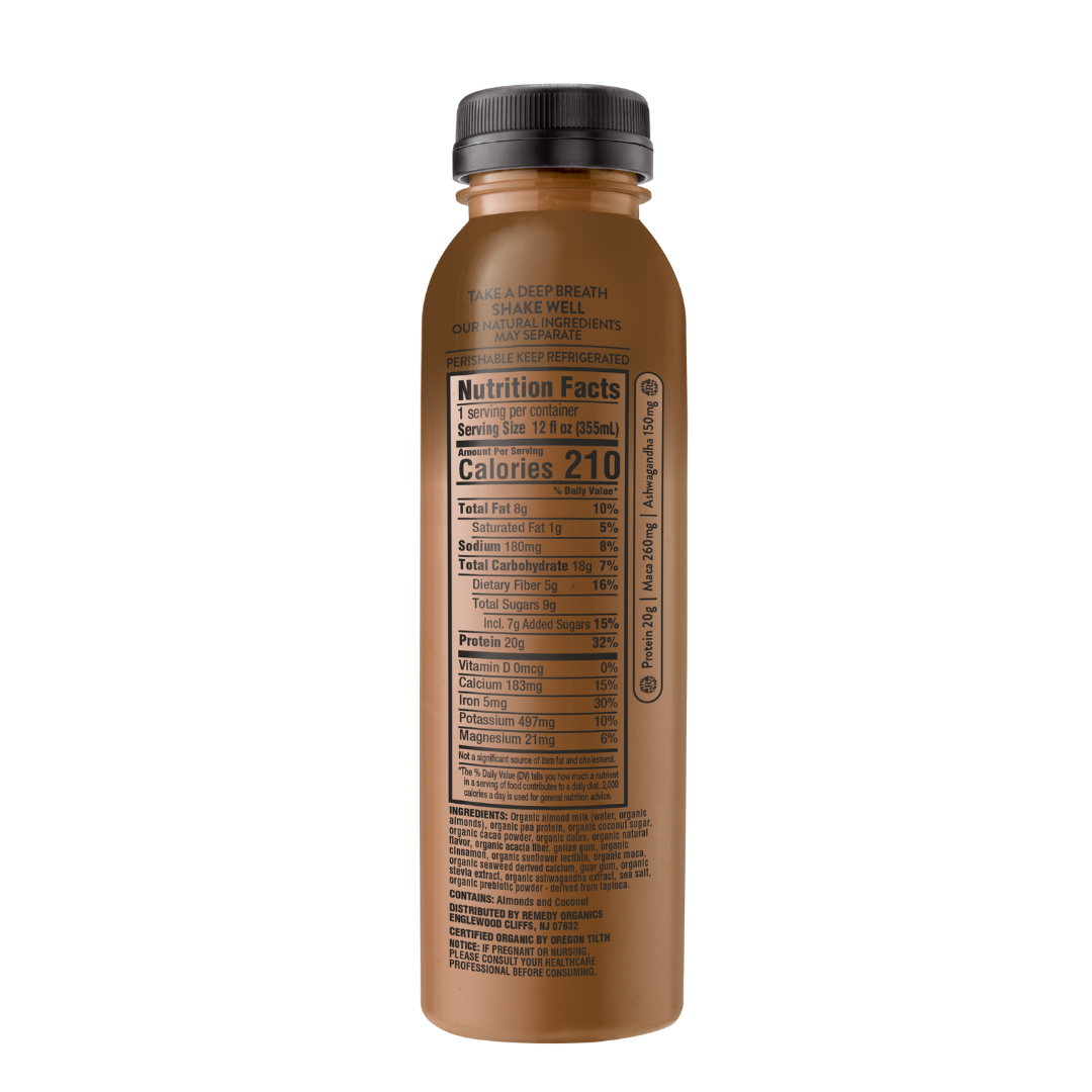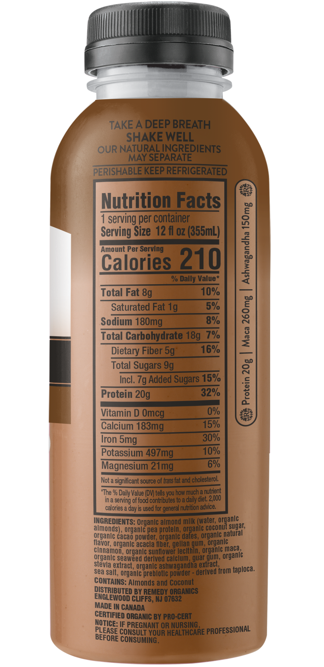Cacao Essentials is 100% plant-based and made with almonds (protein + fiber), hemp seeds (omega-3), cacao (antioxidants), maca (adaptogenic herb), ashwagandha (adaptogenic herb), prebiotics (gut friendly fiber), and protein (muscle recovery). Cacao Essentials contains 16g of protein, 9g of fat, 10g of sugar, and zero cholesterol. Cacao Essentials is USDA organic, non-GMO, dairy-free, gluten-free, soy-free, and vegan.