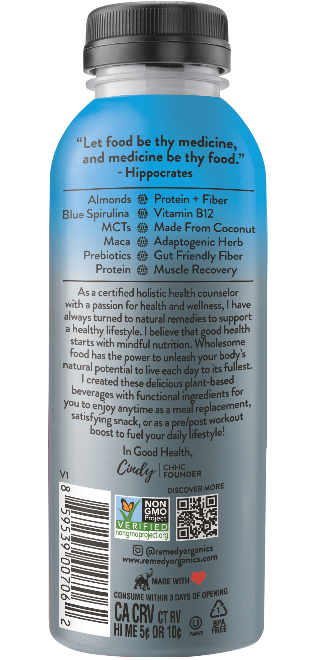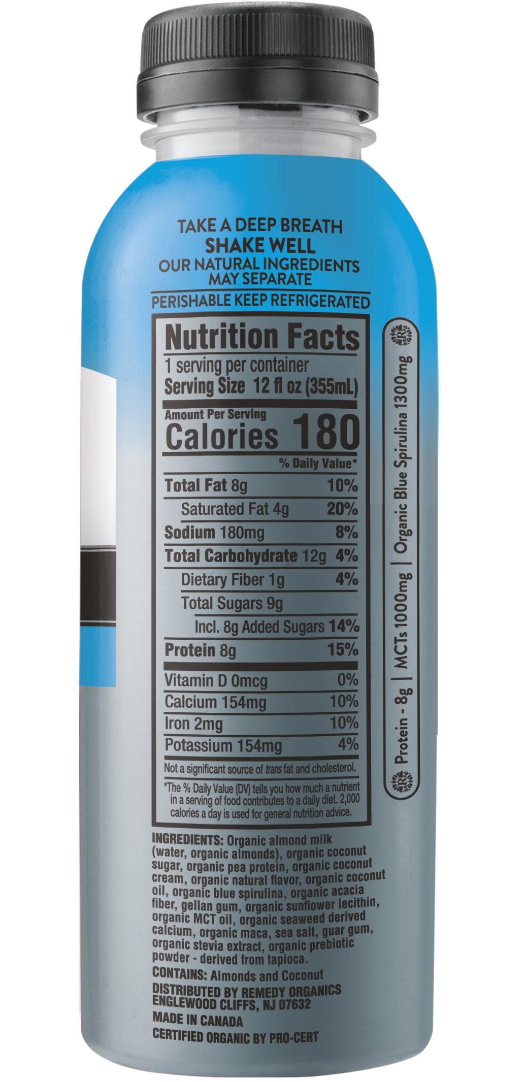 Blue Essentials is 100% plant-based and made with almonds for protein and fiber, MCT oil for omega 3's, maca as an adaptogenic herb, spirulina for Vitamin B12, prebiotics as a gut friendly fiber, and protein for muscle recovery. Blue Essentials contains 8g of protein, 8g of fat, 9g of sugar, and zero cholesterol. Blue Essentials is USDA organic, non-GMO, dairy-free, gluten-free, soy-free, and vegan.