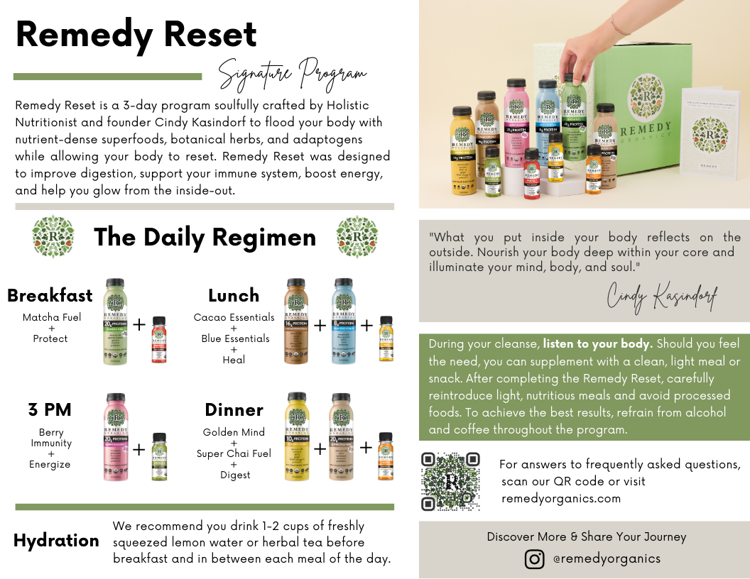The Remedy Reset Cleanse is a 3-Day wellness program created by Holistic Nutritionist, Cindy Kasindorf, designed to reset your body from the inside out. The Reset Cleanse includes: