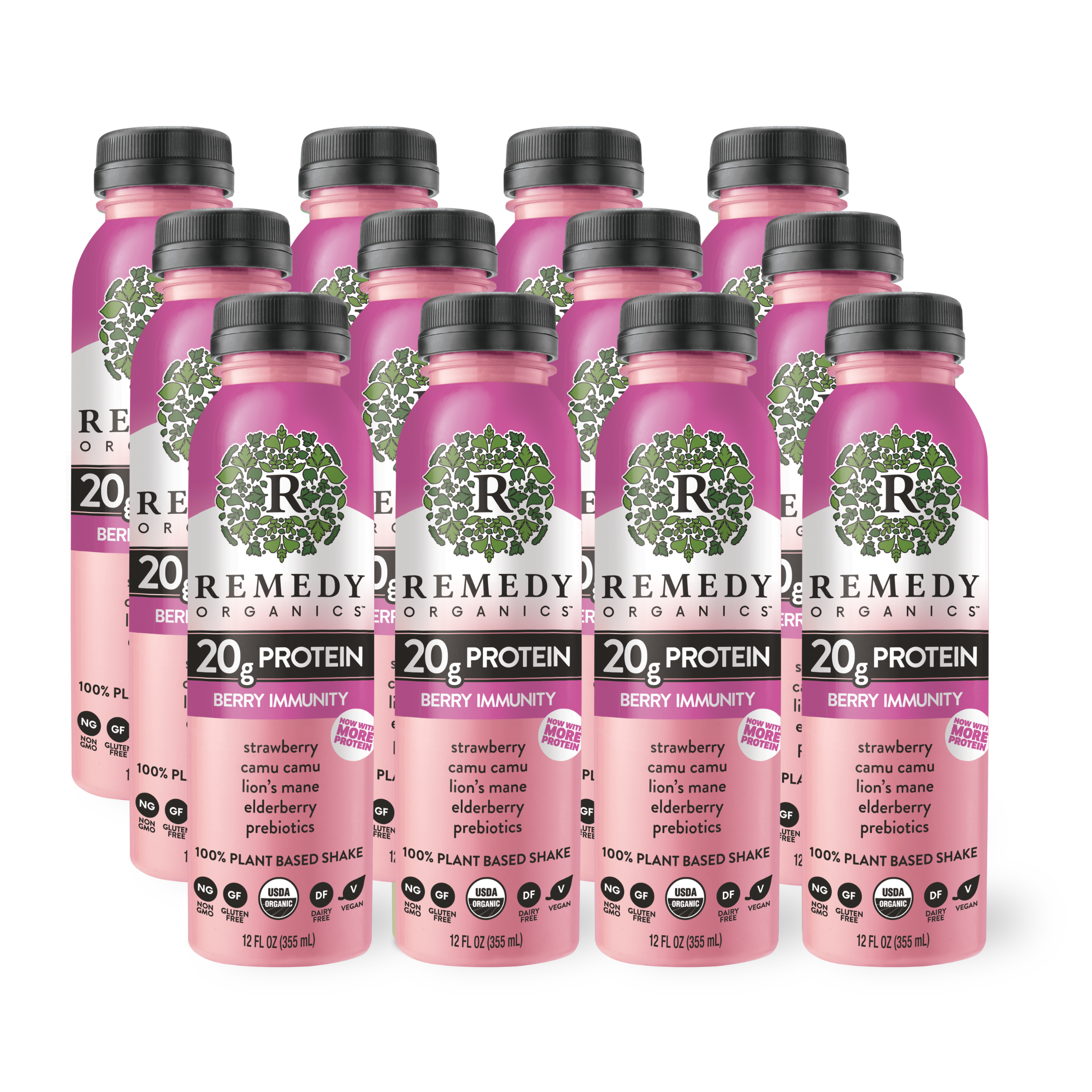 Berry Immunity is 100% plant-based and made with elderberry (antioxidants), camu camu (minerals + Vitamin C), lion’s mane (functional mushroom), prebiotics (gut friendly fiber) and protein for muscle recovery. Berry Immunity is now packed with 20g of Plant-Protein! Berry Immunity is USDA organic, non-GMO, dairy-free, gluten-free, soy-free, and vegan.