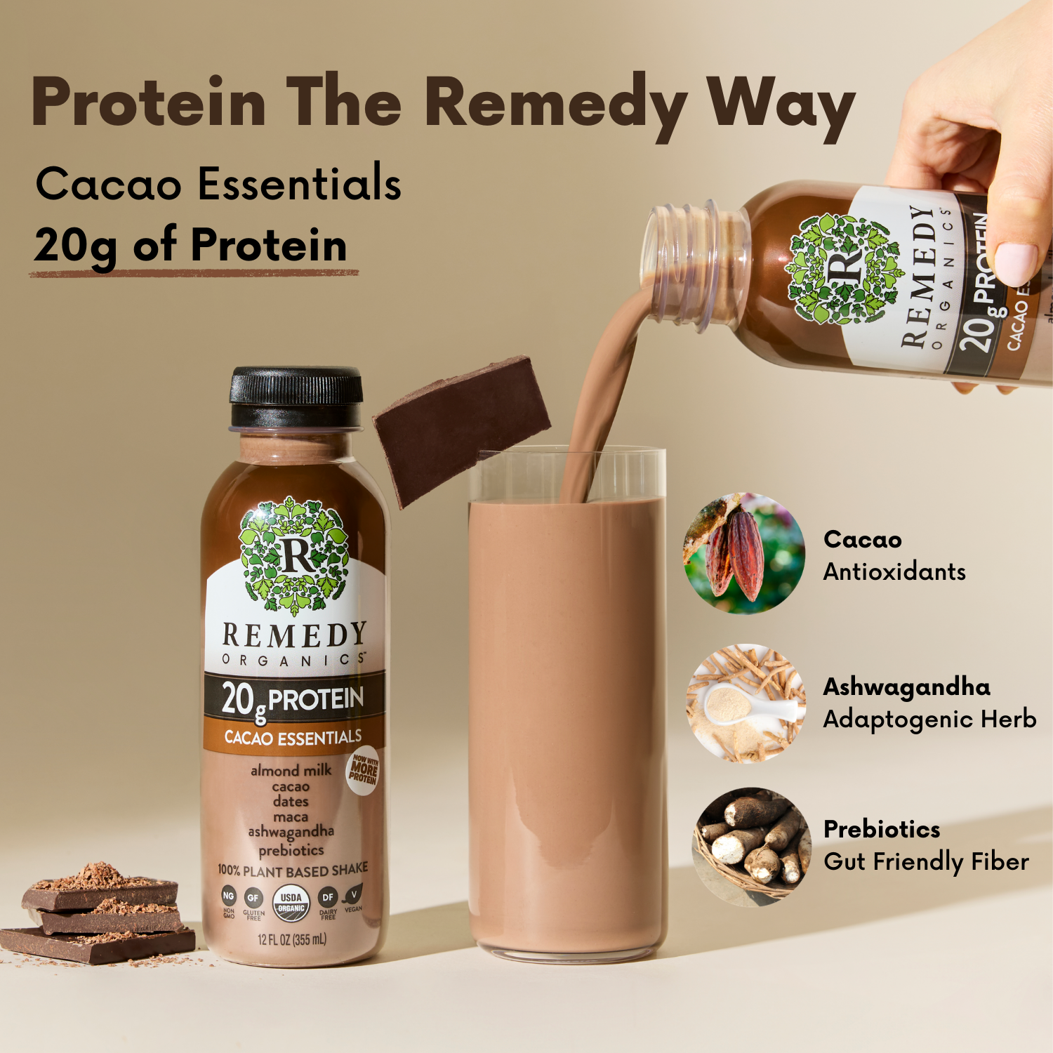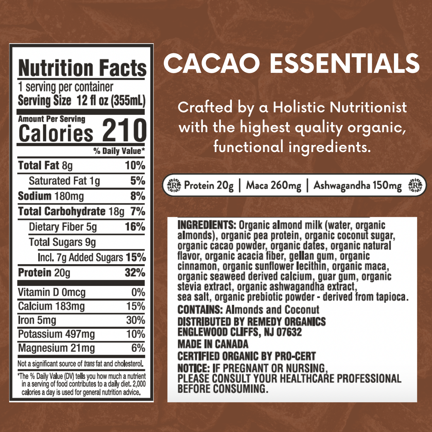 Cacao Essentials is 100% plant-based and made with almonds (protein + fiber), hemp seeds (omega-3), cacao (antioxidants), maca (adaptogenic herb), ashwagandha (adaptogenic herb), prebiotics (gut friendly fiber), and protein (muscle recovery). Cacao Essentials contains 16g of protein, 9g of fat, 10g of sugar, and zero cholesterol. Cacao Essentials is USDA organic, non-GMO, dairy-free, gluten-free, soy-free, and vegan.